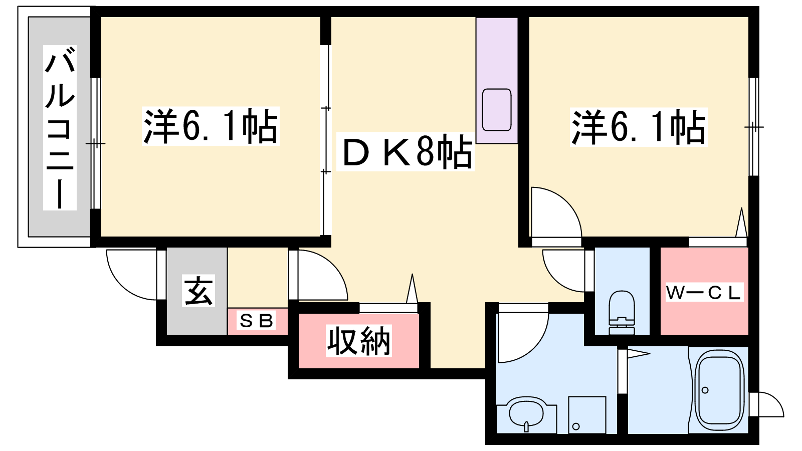 - DK8帖、洋室6.1帖、洋室6.1帖