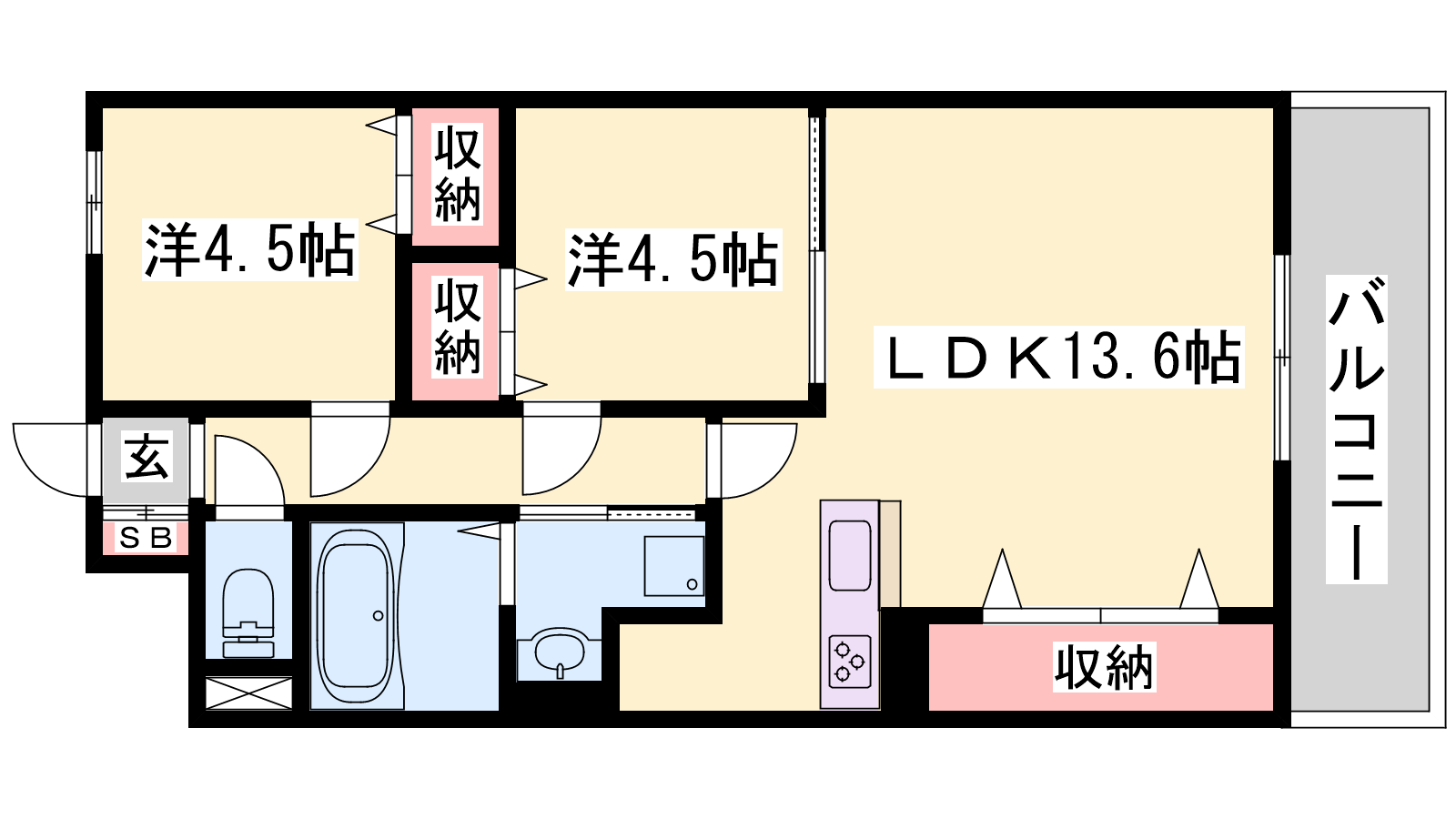 - LDK13.6帖、洋室4.5帖、S4.5帖