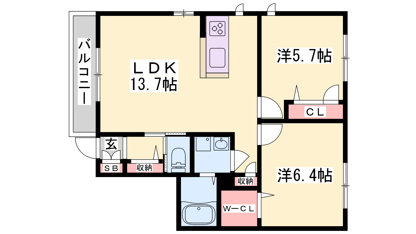 - LDK13.7帖、洋室6.4帖、洋室5.7帖