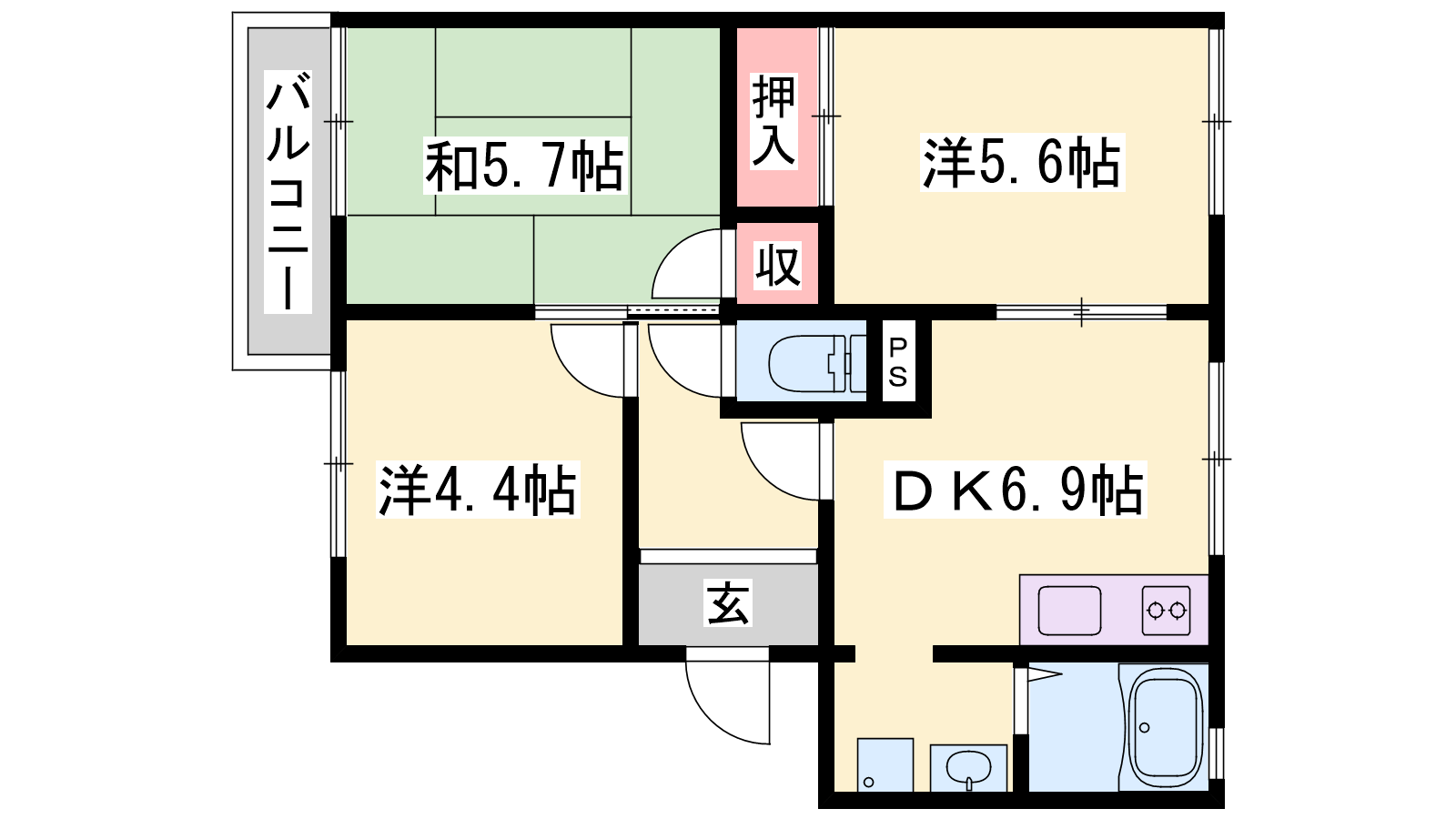 - DK6.9帖、洋室4.4帖、和室5.7帖、洋室5.6帖