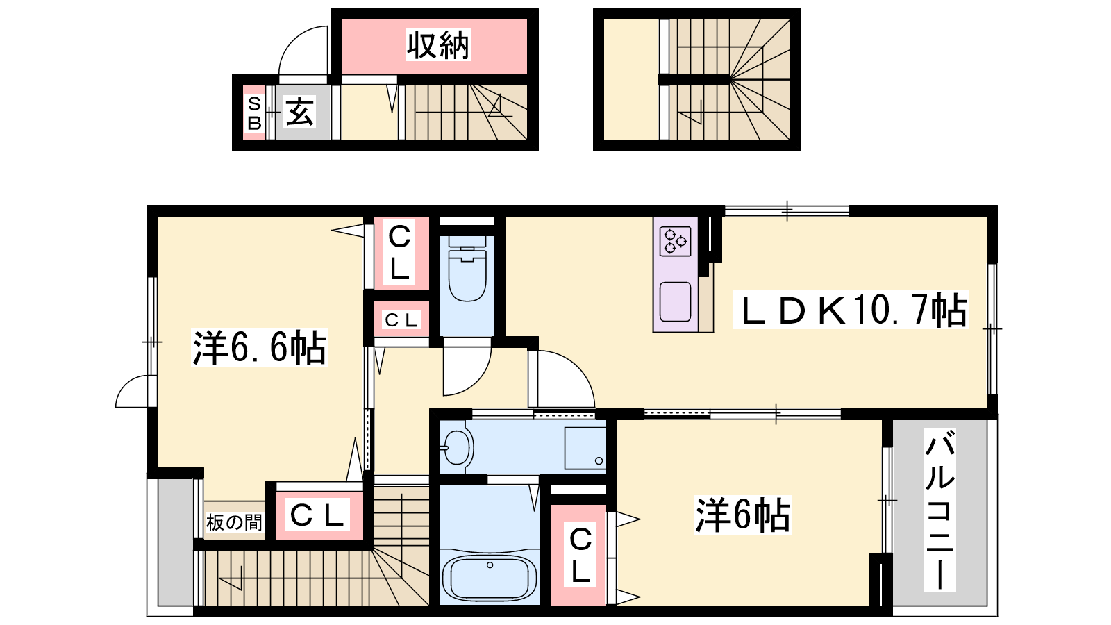 - LDK10.7帖、洋室6.6帖、洋室6帖