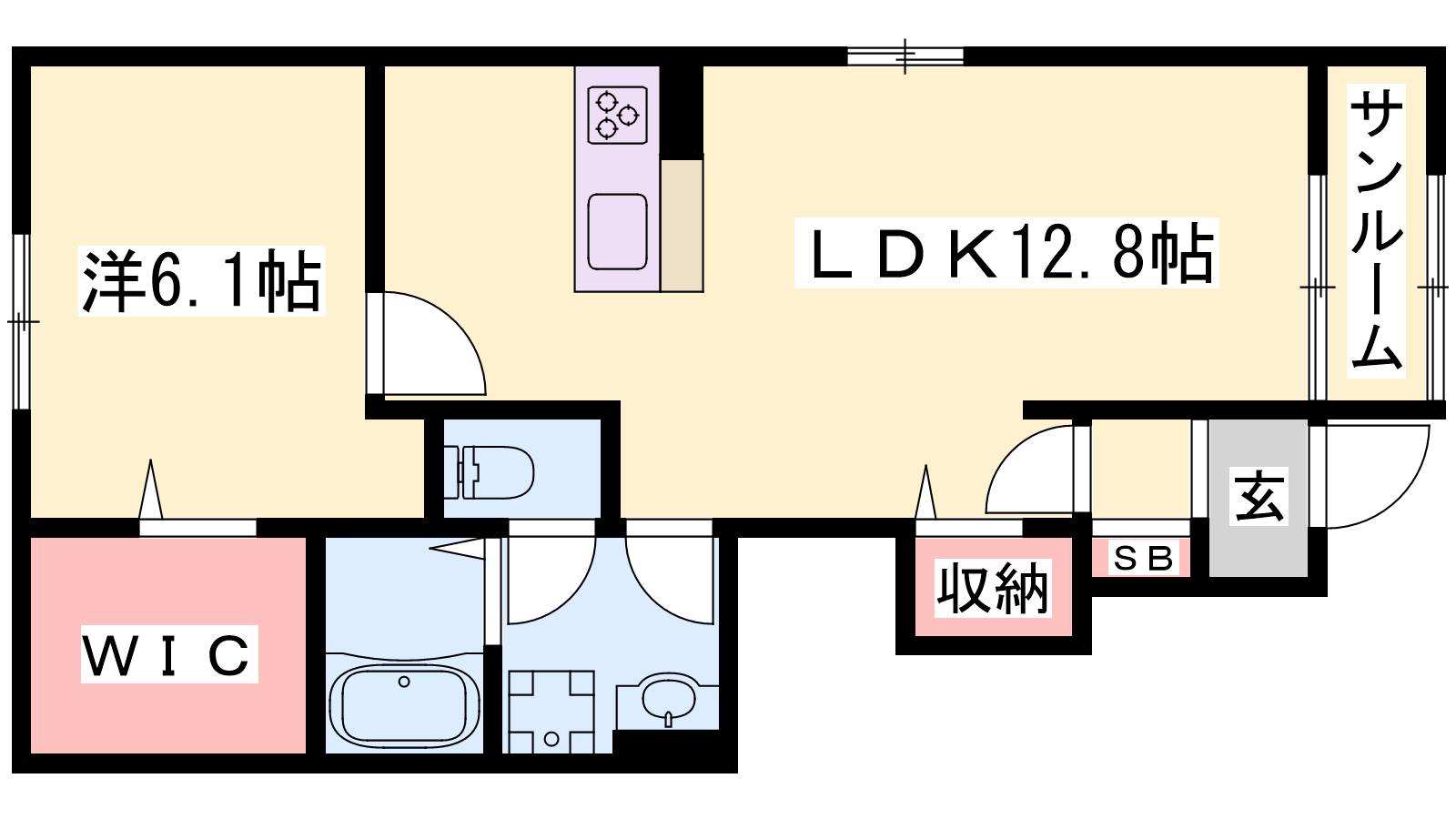 - LDK12.8帖、洋室6.1帖