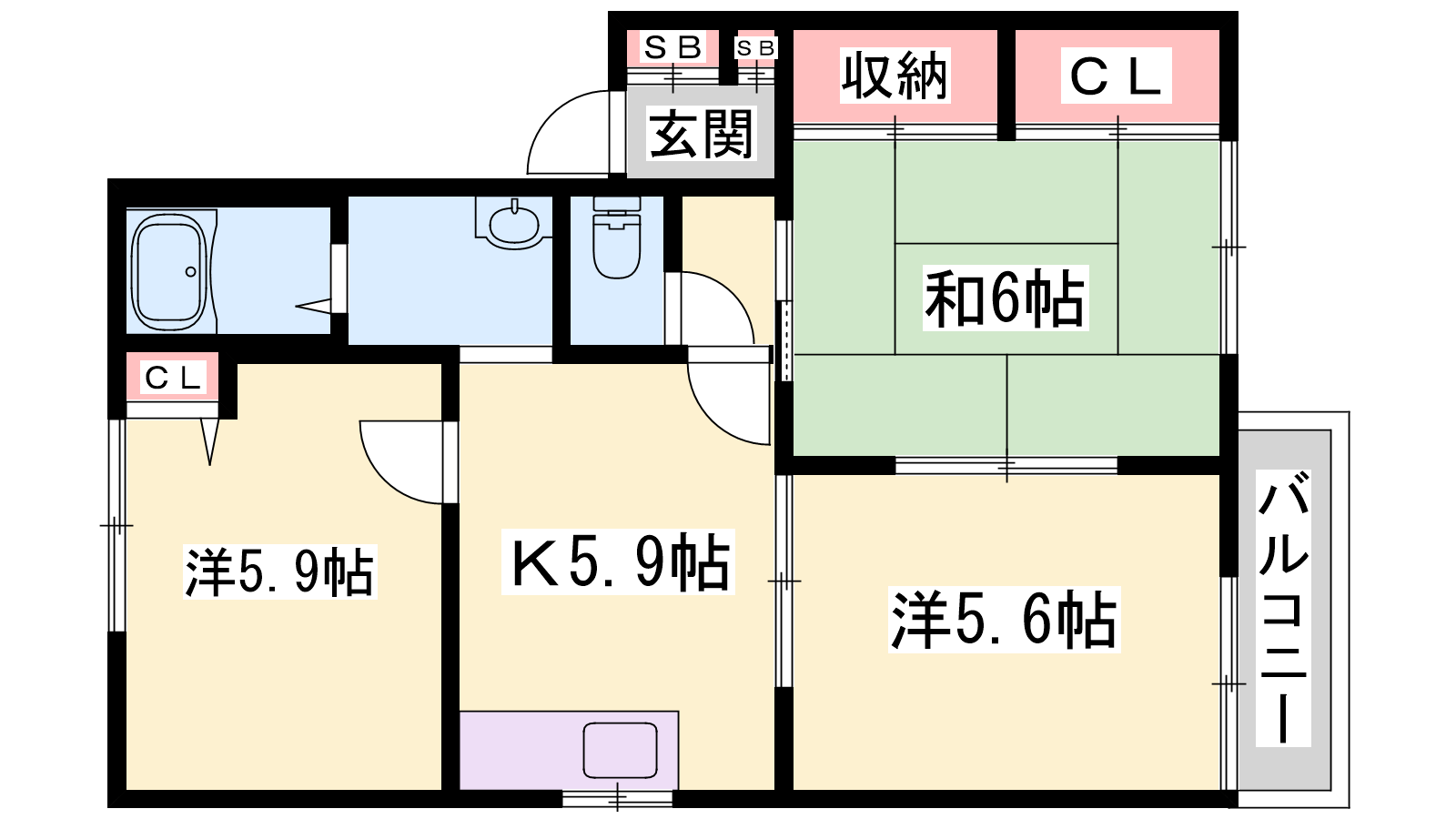 - K5.9帖、洋室5.9帖、洋室5.6帖、和室6帖