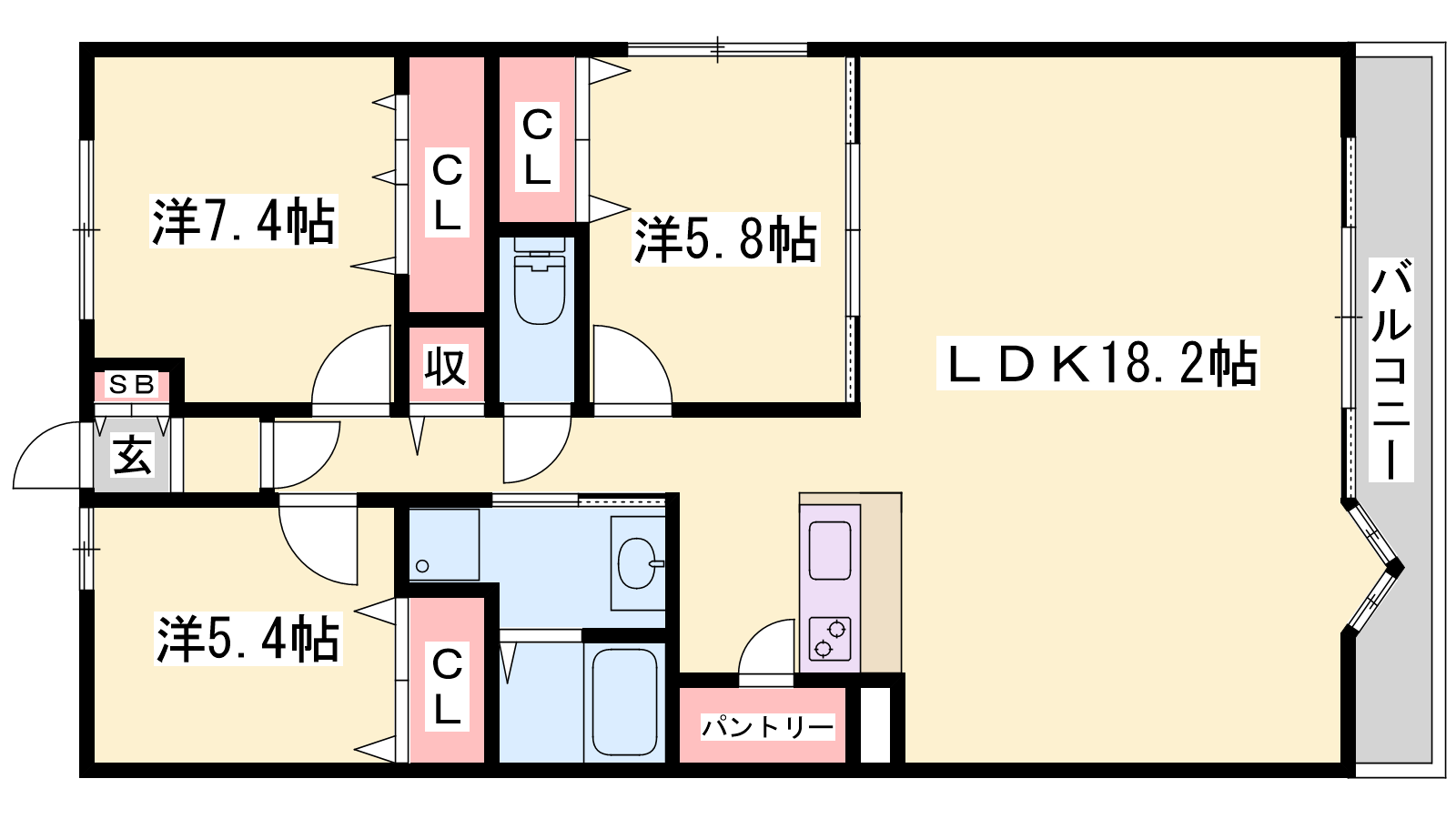 - LDK18.2帖、洋室7.4帖、洋室5.8帖、洋室5.4帖