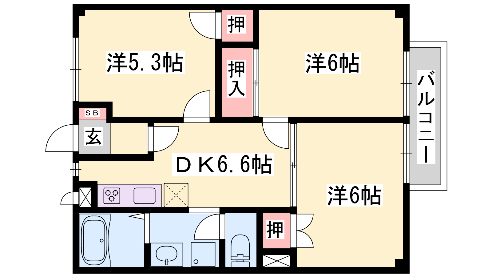 - DK6.6帖、洋室6帖、洋室6帖、洋室5.3帖