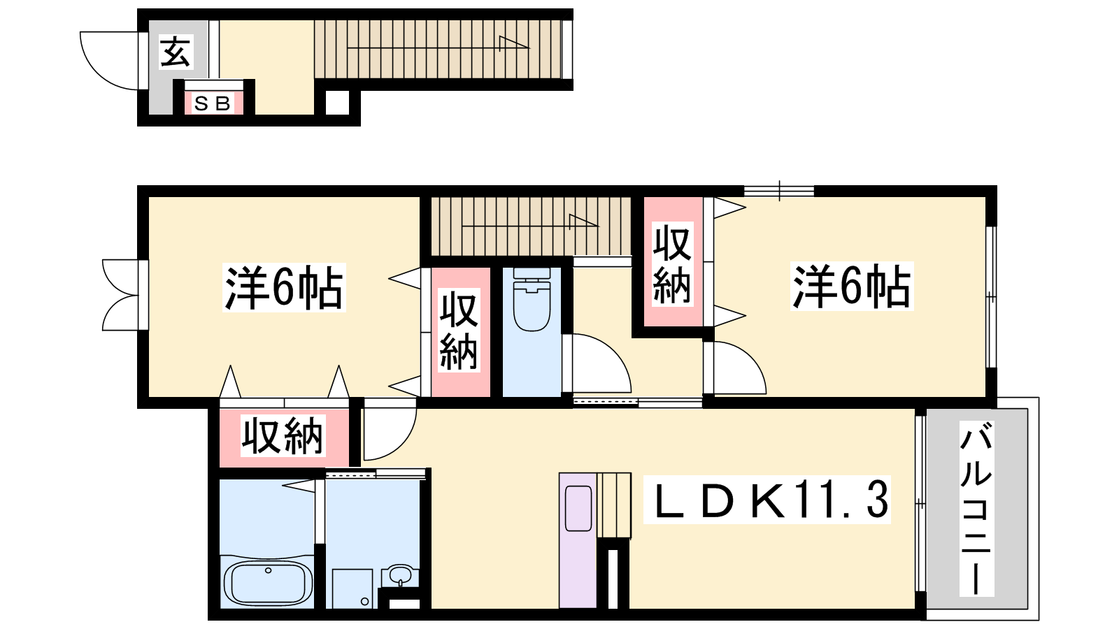 - LDK11.3帖、洋室6帖、洋室6帖