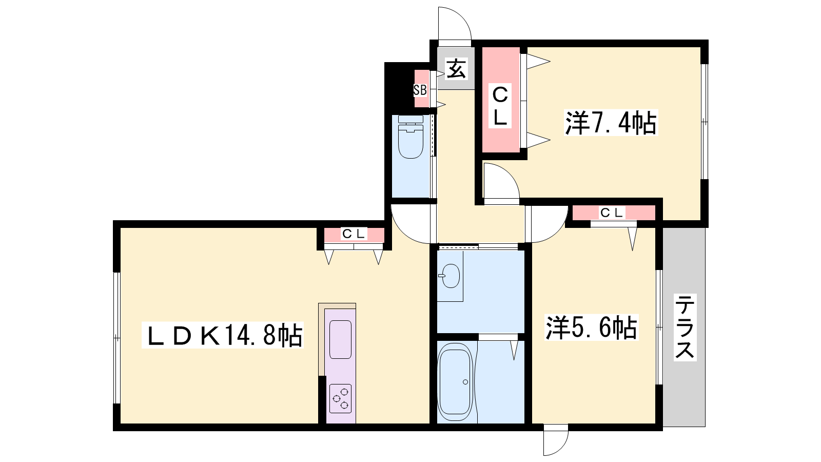 - LDK14.8帖、洋室7.4帖、洋室5.6帖