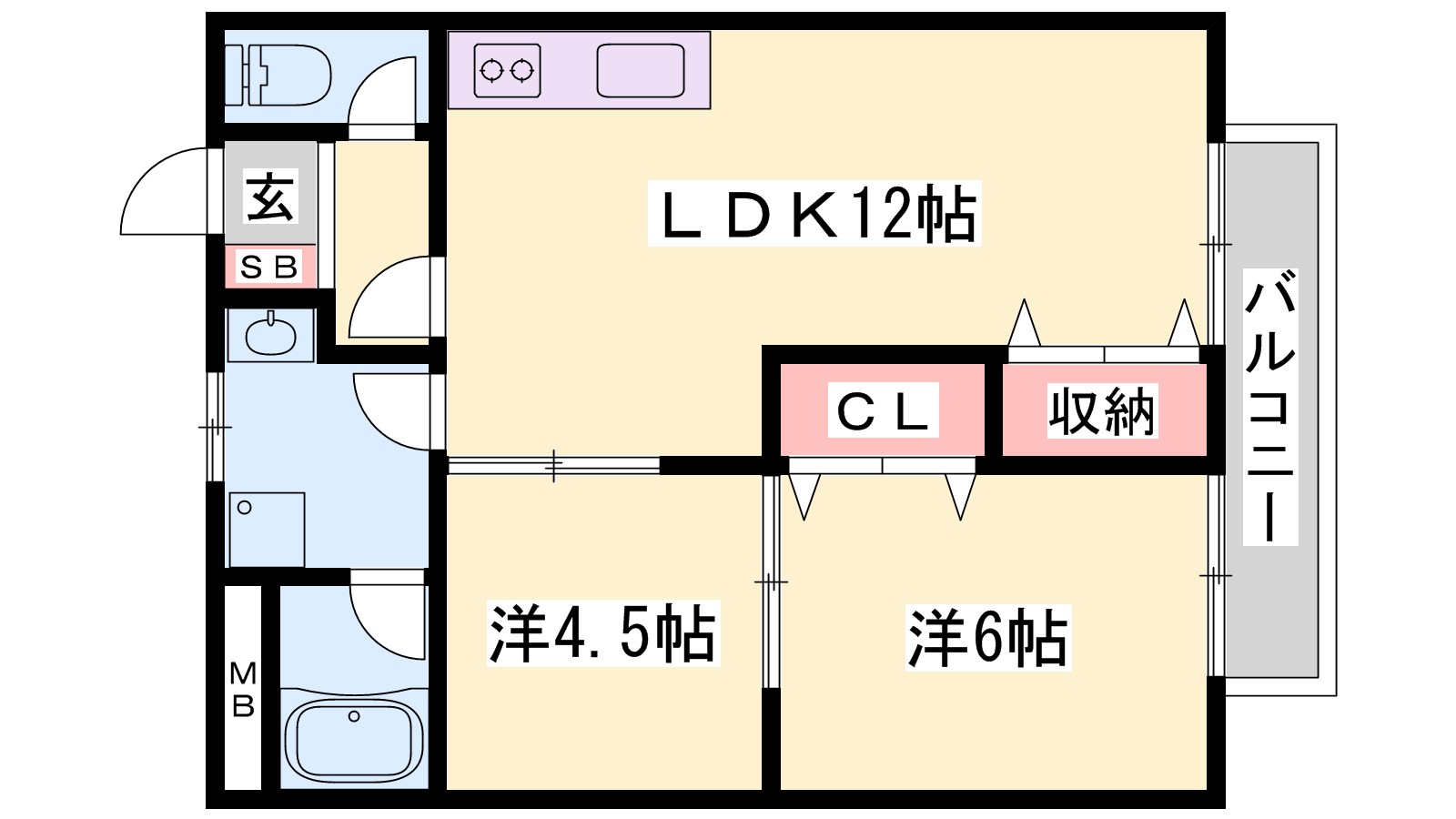 - LDK12帖、洋室6帖、洋室4.5帖