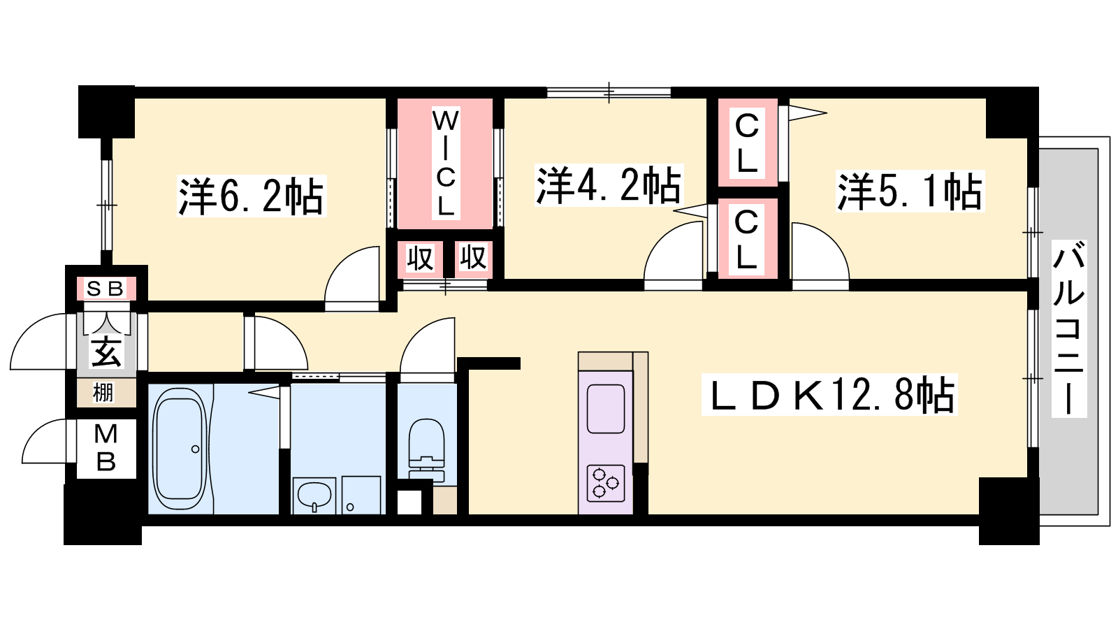 - LDK12.8帖、LDK6.2帖、洋室5.1帖、洋室4.2帖