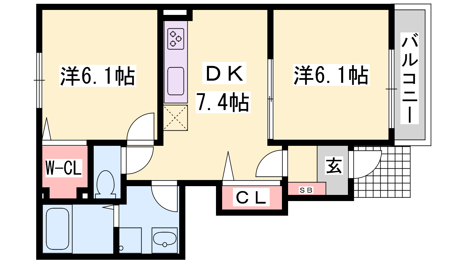 - DK7.4帖、洋室6.1帖、洋室6.1帖