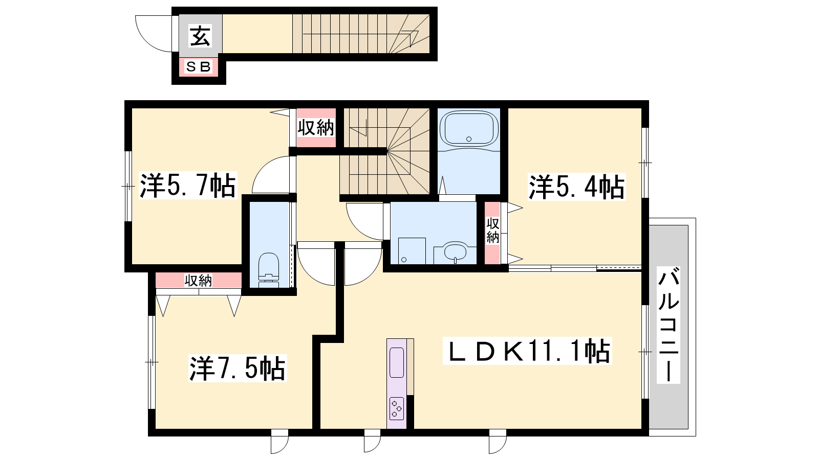 - LDK11.1帖、洋室7.5帖、洋室5.7帖、洋室5.4帖