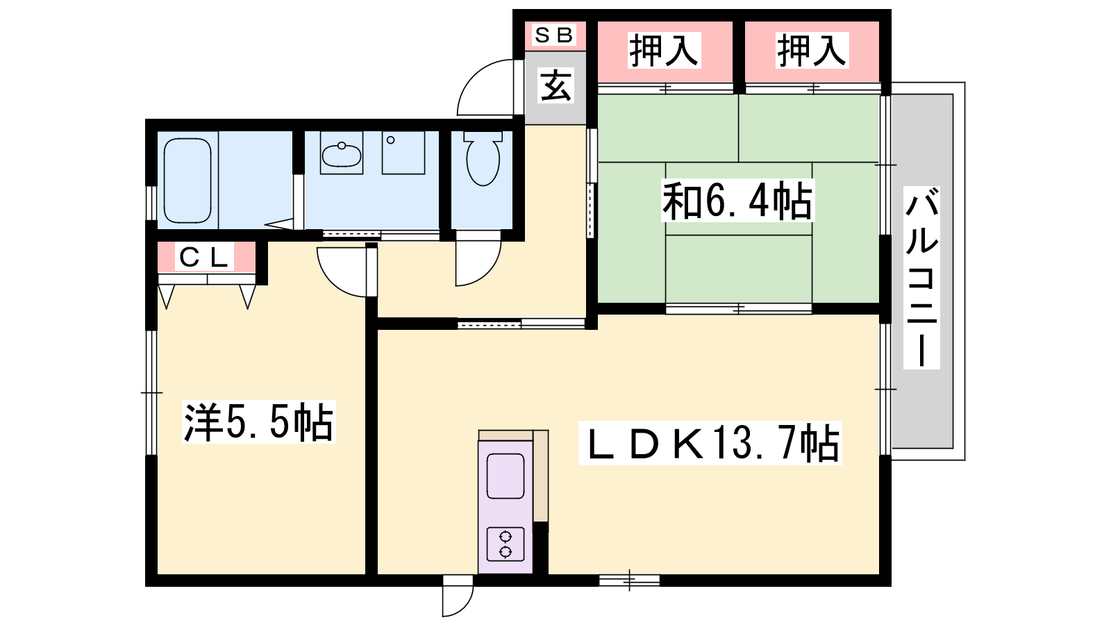 - LDK13.7帖、洋室5.5帖、和室6.4帖