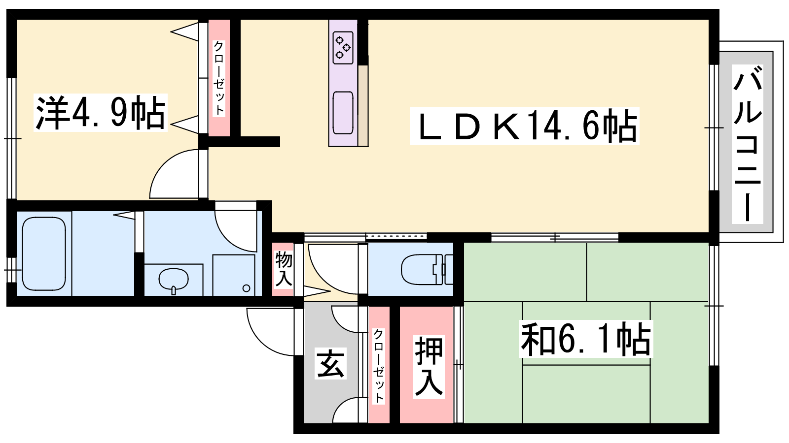 - LDK14.6帖、洋室4.9帖、和室6.1帖