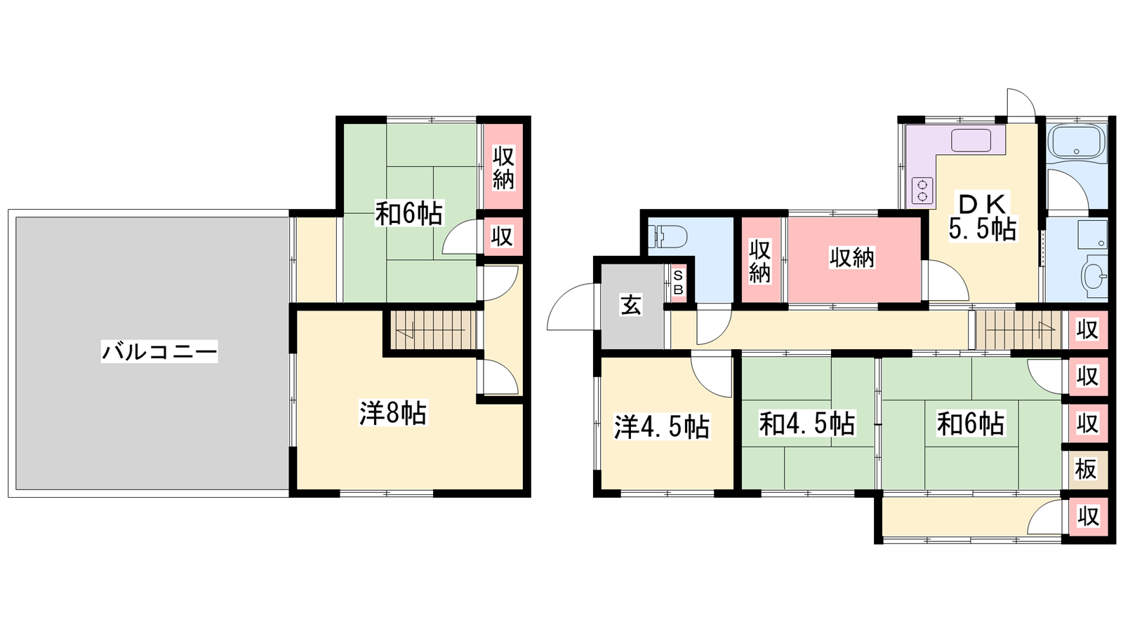 - DK5.5帖、洋室8帖、和室6帖、和室6帖、洋室4.5帖、和室4.5帖